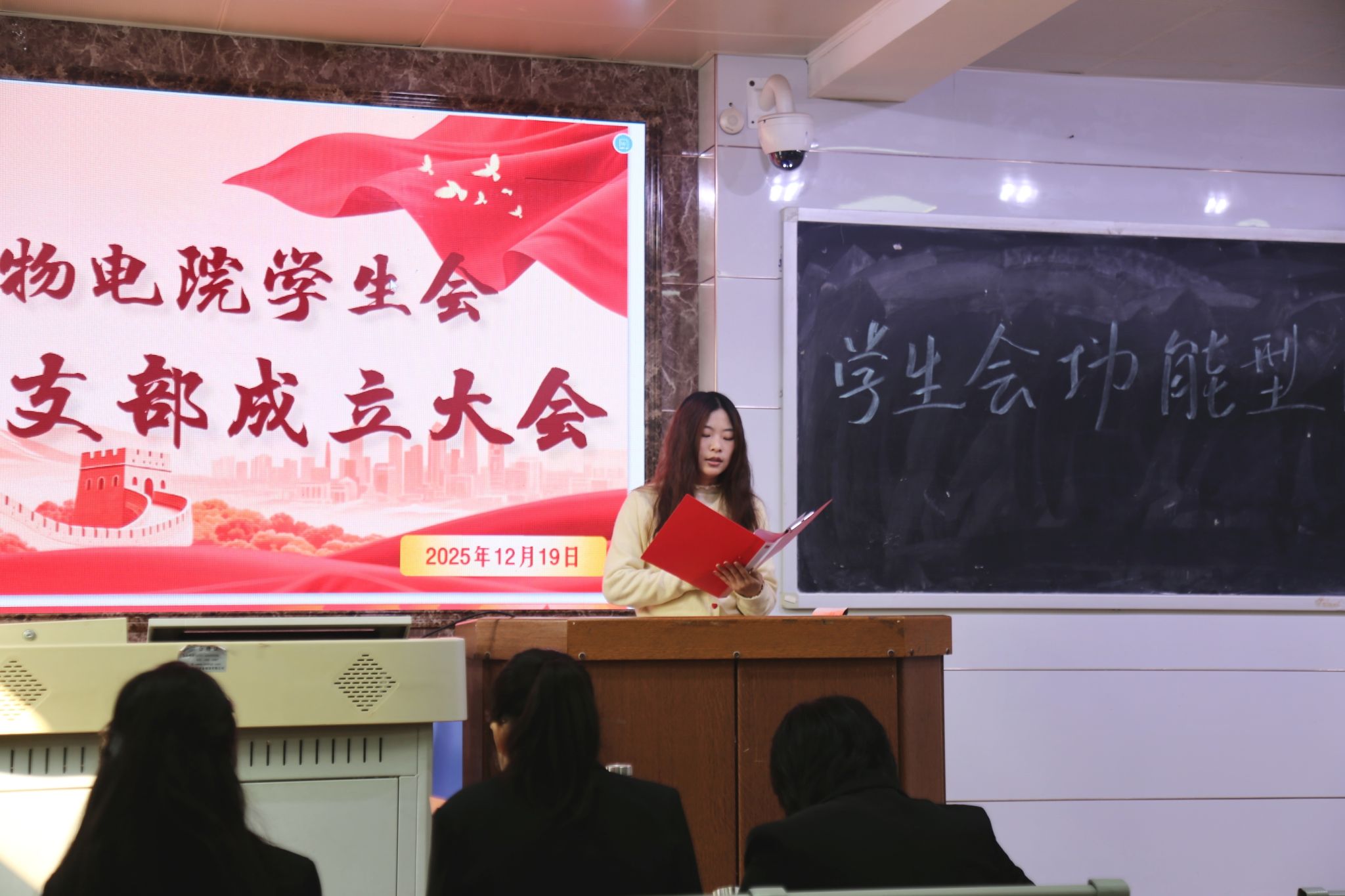 戴文纯进行开场致辞,介绍了学生会共同体团支部的功能,阐释其成立意义,并希望大家能够筑牢思想根基、聚焦服务核心、锤炼过硬作风,共同为学生会共同体团支部的发展注入青春动能。随后,五位竞选人为竞选成为团支部委员会成员上台发言。台下学生会成员根据竞选人的发言内容进行投票。选票统计完毕后,蒋文卓上台宣读此次选举结果,并宣布学生会功能型团支部正式成立。