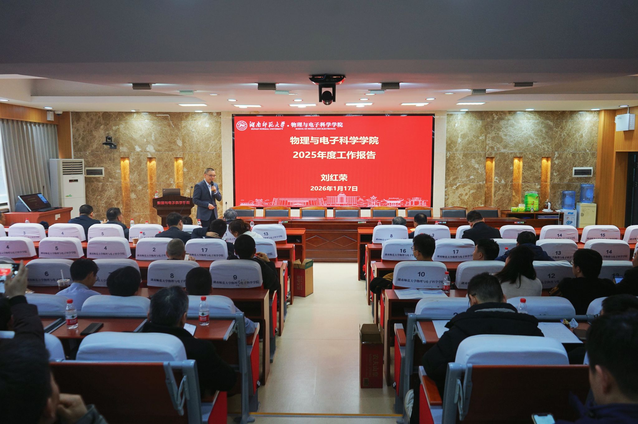 2026年1月17日,物理与电子科学学院在格物楼509报告厅召开2025年度工作总结大会,全面回顾过去一年学院在党建引领、人才培养、师资建设、科学研究、社会服务等方面取得的丰硕成果,并对2026年重点工作进行部署与展望。副校长刘红荣出席并作年度工作报告,深圳校友会会长周山雪教授和学院全体教职工参会,会议由副院长李友明主持。