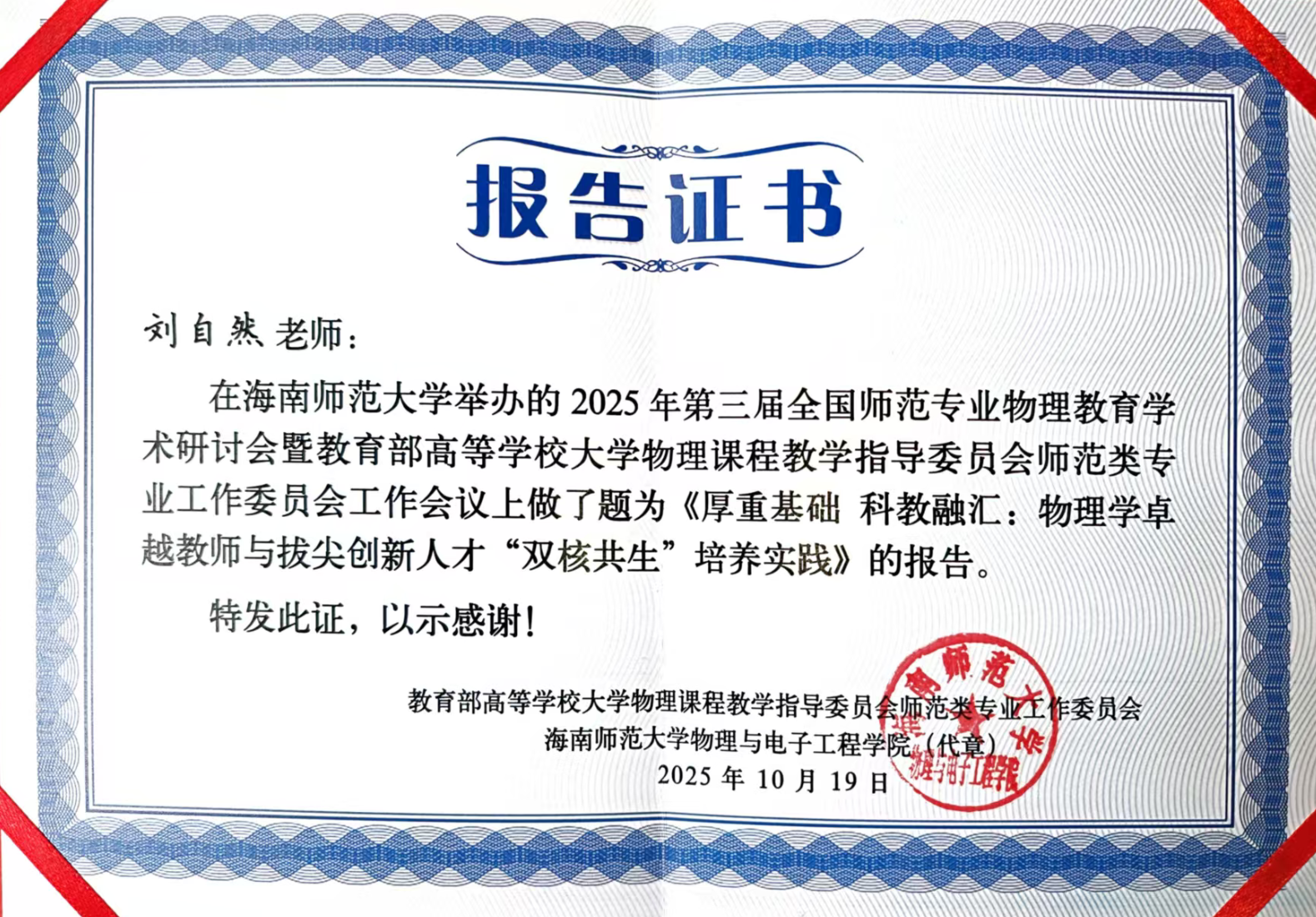 在第三届全国师范专业物理教育学术研讨会中,我院唐东升教授作为大会执行主席主持了清华大学王青教授的大会报告,并为粉笔字大赛获奖同学颁奖。我院刘自然教授应邀作了题为《厚重基础 科教融汇:物理学卓越教师与拔尖创新人才双核共生培养实践》的教学报告。报告首先回顾了我院物理学专业的办学特色和近年来取得的教学成果,然后系统介绍了“双核共生”人才培养模式。该模式强调以“厚重基础”筑牢学科根基,以“科教融汇”促进科研与教学深度融合,旨在培养兼具科研素养的卓越教师和具备教学能力的拔尖创新人才,并实现两类人才的协同发展。报告内容引发了与会专家的广泛讨论和高度评价,为全国物理学师范专业的人才培养提供了宝贵的“湖师大经验”。