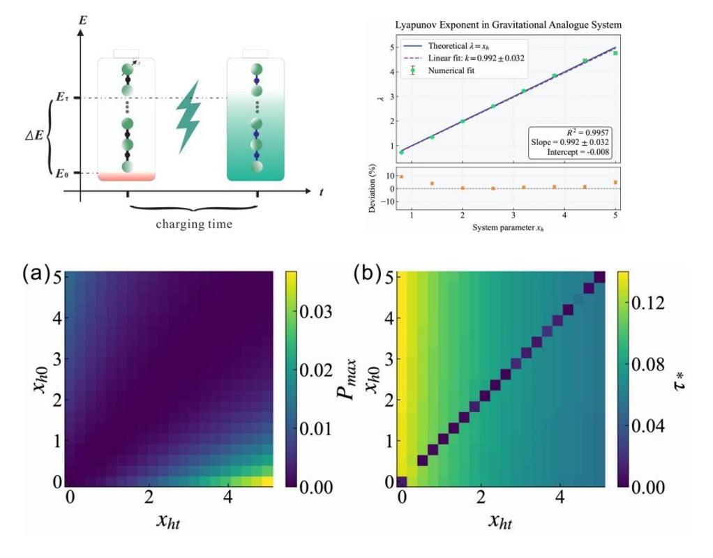 图 1 引力系统量子电池模型及充电示意图(左上),黑洞置乱行为数值拟合结果(右上),淬火带来的性能优化最大功率(左下)和最佳充电时间(右下)的数值结果。