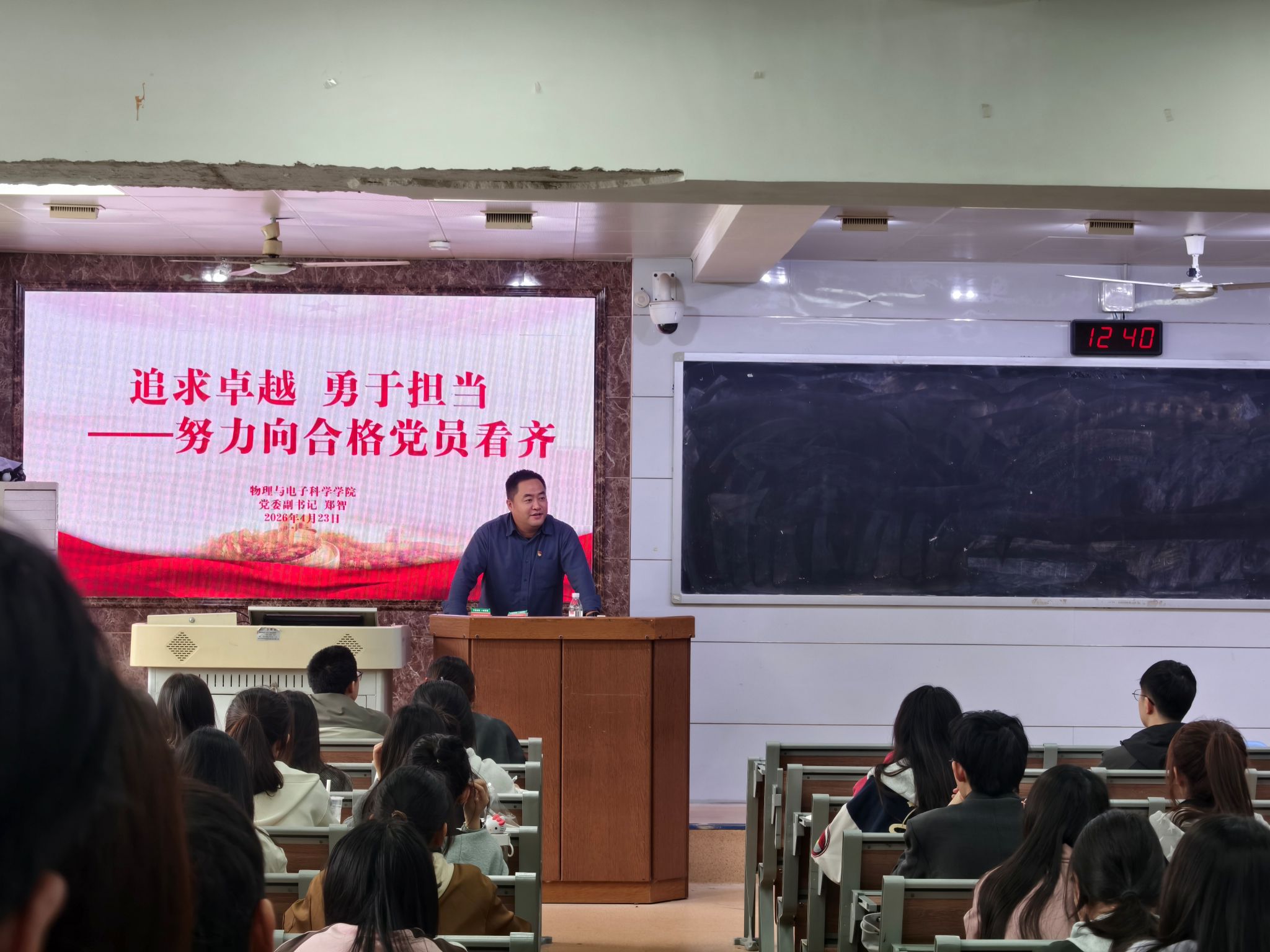 仪式结束后,郑智以“追求卓越,勇于担当——努力向合格党员看齐”为题讲授专题党课。他结合理论与实践,围绕四大核心内容展开授课,深刻阐释民族复兴的时代夙愿、党引领前行的领航力量,讲解党员律己修身准则与入党规范流程。同时他也希望全体参训学员以此次学习为全新起点,砥砺锤炼党性修养,脚踏实地奋勇争先,早日加入党组织。